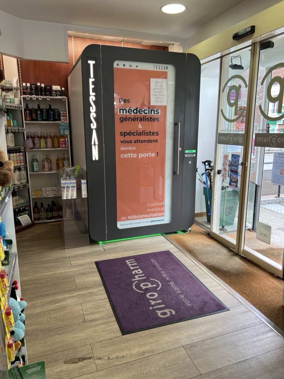 À Noailles, la Pharmacie de Noailles propose la téléconsultation en pharmacie sur borne Tessan : prise de constantes via appareils connectés, échange sécurisé avec le médecin et ordonnance immédiate.